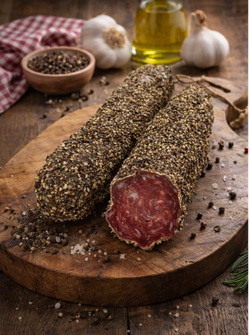 93 % viande porc dont 80 % de jambon, gras de porc 7%. sel, lactose, dextrose, épices, conservateur : nitrate de potassium. Enrobage de poivre, boyau naturel, bridé à la main.